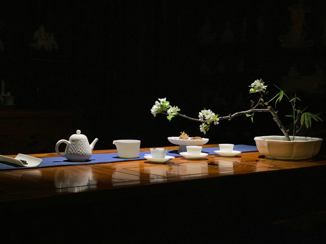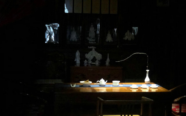 整个空间的区域,以灯光来区隔。关闭了白瓷艺术品的照明灯,几个茶席空间就脱颖而出。