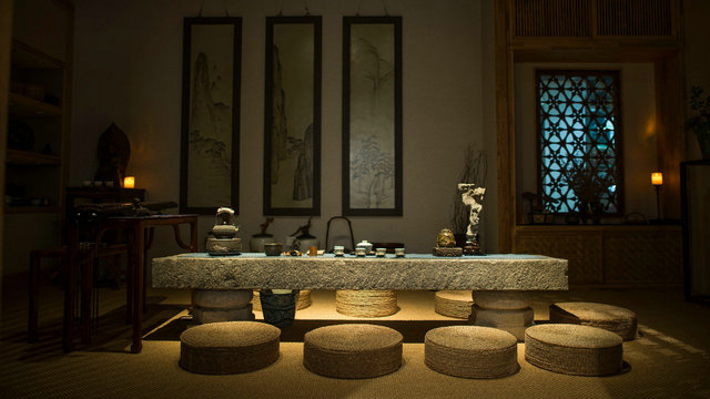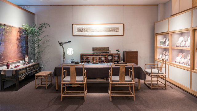 空间布置疏密有致,功能分布合理。除了茶器具、茶席,还有古琴、书画、太湖石等多元文化元素,整体呈现出一定的美学意境。