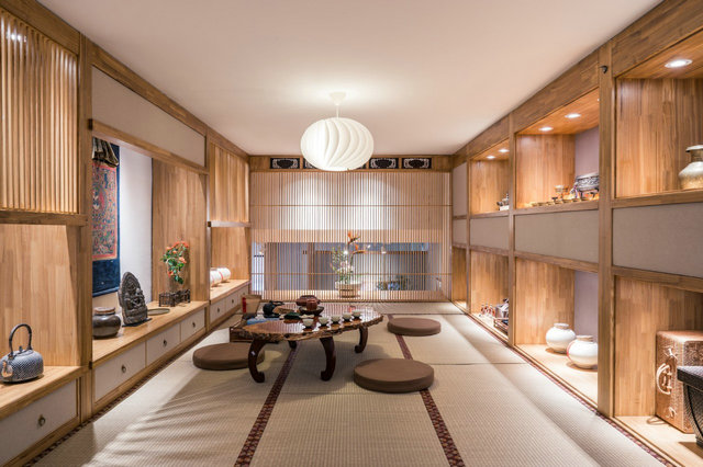 后面的一间茶室,用日式推拉门和榻榻米,营造出了“一期一会”的艺术氛围。