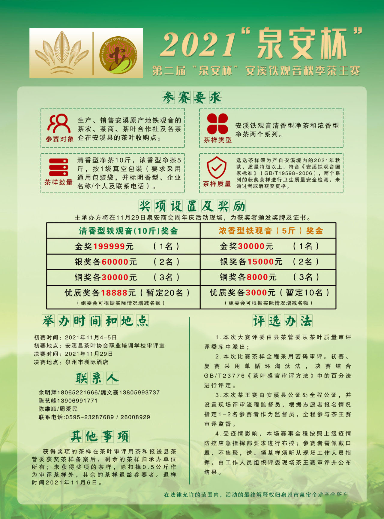 获得奖项的茶样在茶叶审评用茶和报送县茶管委获奖茶样备案后,剩余的茶样归承办单位所有;未获得奖项的茶样,除扣掉0.5公斤作为审评茶样外,其余的茶样退还参赛者。退样时间2021年11月6日。 据了解,这两年,泉安企业商会竭尽所能不遗余力地采取各种措施,推动泉州地区安溪铁观音市场的繁荣。今年初泉安企业商会牵头在泉州市区打造的泉安荟,集中展示了去年首届“泉安杯”茶王赛的获奖企业的好茶,让更多泉州人了解什么是安溪原产地铁观音,掌握如何品鉴安溪铁观音好茶。在今年国庆前安溪县委县政府举办秋茶产销对接大会上,谢贵林会长代表泉州市泉安企业商会在对接大会上分别和几家茶业公司及合作社签了购买秋茶100吨的大单,为安溪铁观音茶叶销售贡献一份绵力,也给泉州爱茶人带来一杯好茶。秋茶采摘期间,商会谢贵林、余明辉等人陪同安溪县领导走访了安溪几个茶叶主产乡镇,对今年秋茶的品质非常认可。而接下去即将举办的第二届“泉安杯”茶王赛,也必将在泉州掀起“安溪铁观音热”,进一步提升安溪铁观音的知名度、美誉度和影响力,让更多泉州人了解安溪、走近安溪。