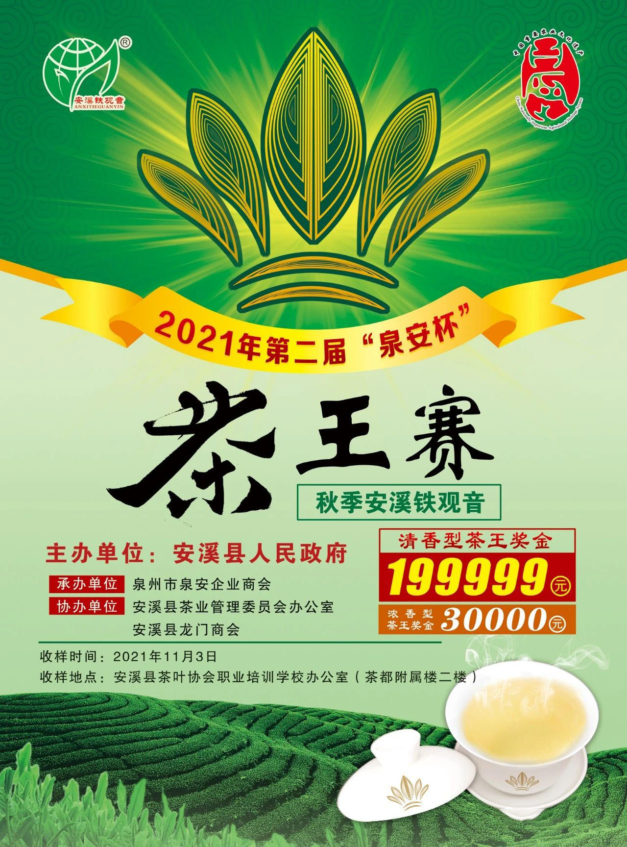 由安溪县人民政府主办、泉州市泉安企业商会承办、安溪县茶业管理委员会办公室和安溪县龙门商会协办的第二届“泉安杯”秋季安溪铁观音茶王赛,清香型铁观音金奖奖金达199999元!目前有些茶人已在准备茶样,与去年不同的是,今年收样时间只有一天,想参赛的茶人朋友们请记住:11月3日到安溪县茶叶协会职业培训学校办公室(茶都附属楼二楼)送样。