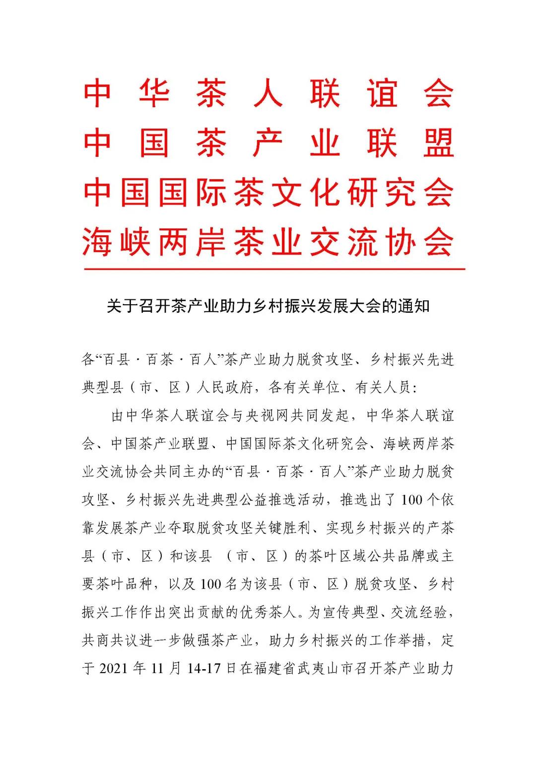 为宣传典型、交流经验,共商共议进一步做强茶产业,助力乡村振兴的工作举措,定于2021年11月14-17日在福建省武夷山市召开茶产业助力乡村振兴发展大会。