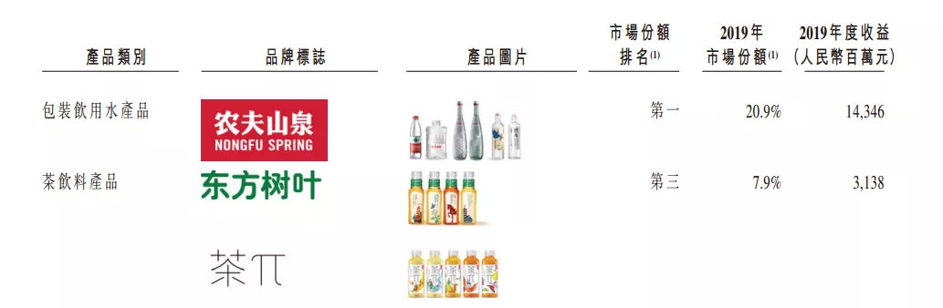 根据弗若斯特沙利文报告,2012年至2019年间,农夫山泉连续八年保持中国包装饮用水市场占有率第一,以2019年零售额计,农夫山泉在茶饮料、功能饮料及果汁饮料的市场份额均居中国市场前三位。