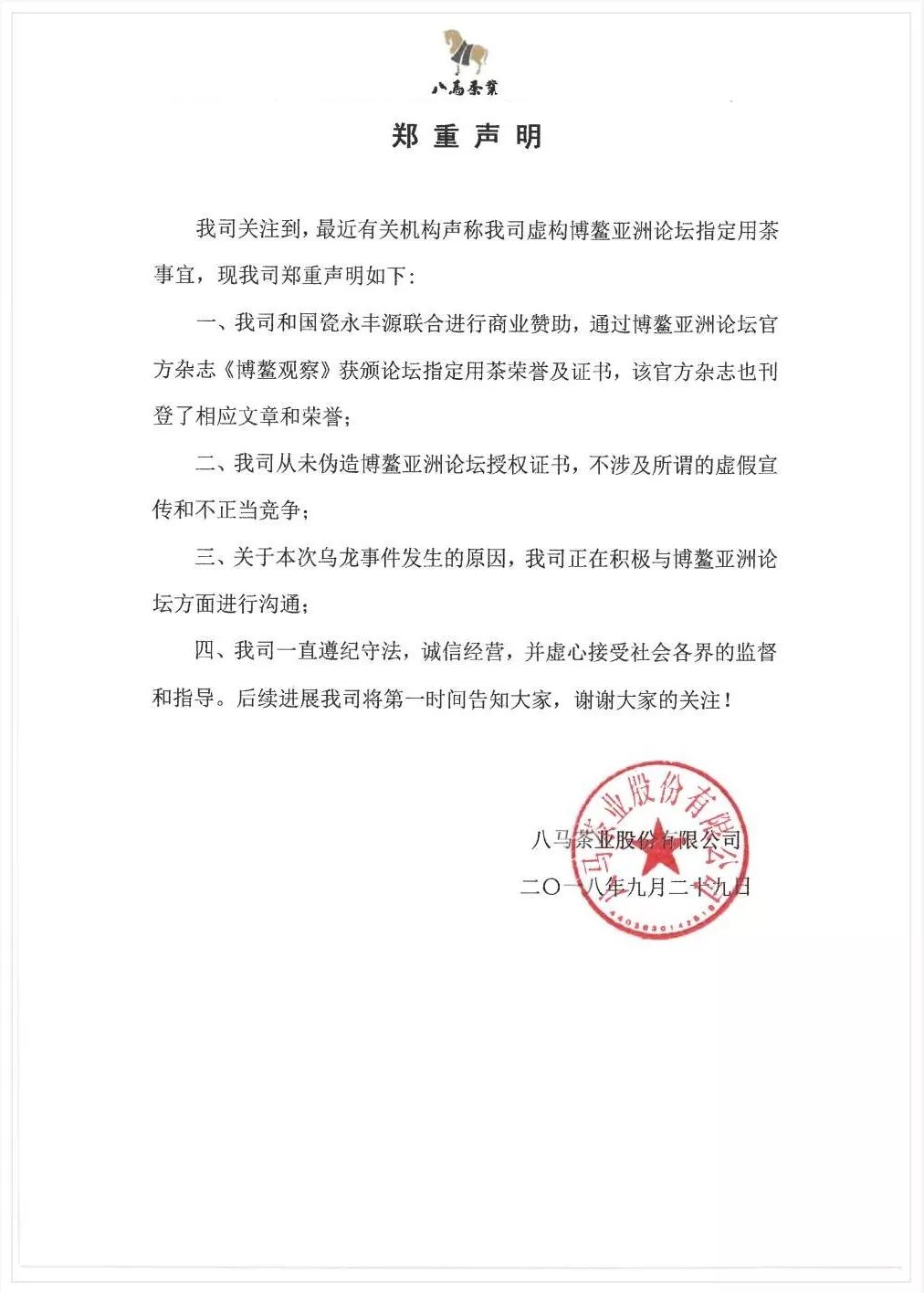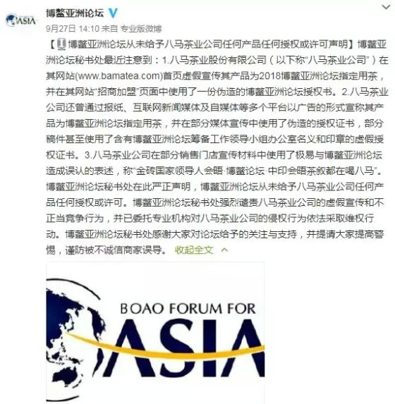 5个月之后,也就是2018年9月27日下午,博鳌亚洲论坛官方微信微博发布声明,标题和内容称“博鳌亚洲论坛”从未给予“八马茶业股份有限公司”任何产品授权或许可声明,直指八马茶业伪造证书、虚假宣传、不正当竞争!